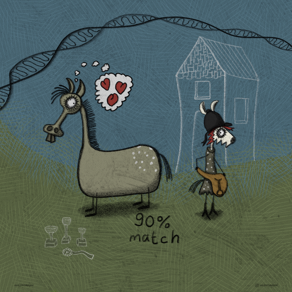 DNA Match è una serie di illustrazioni che mette a confronto esseri umani e animali attraverso percentuali di affinità genetica.