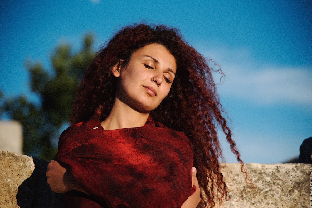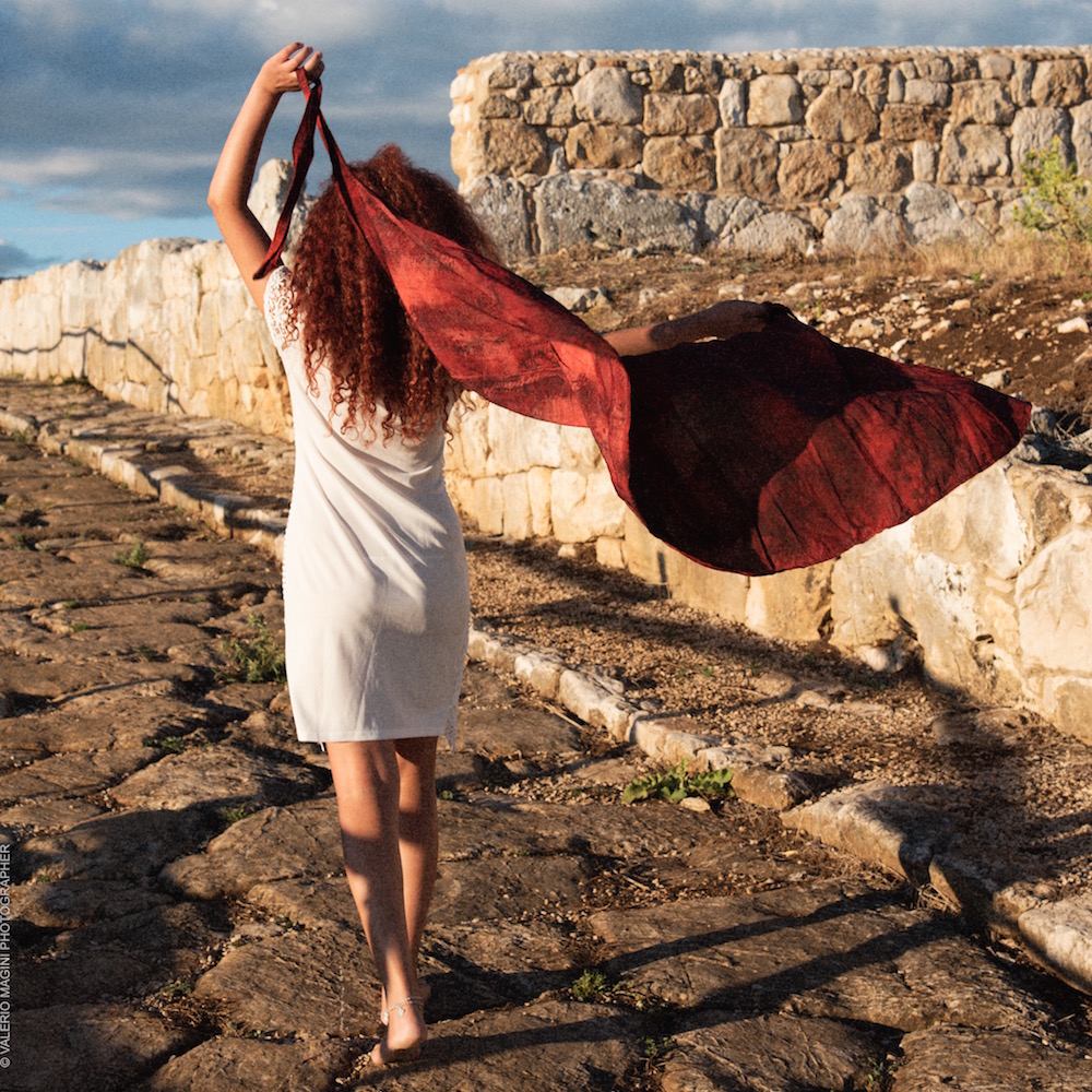 Un drappo rosso le scende sulle spalle avvolgendola in un abbraccio.